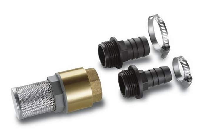 В прочном металлополимерном исполнении. Для присоединения к всасывающим шлангам, поставляемым метражом. С хомутом. Обратный клапан ускоряет повторный пуск насоса.Входной ф. с обр. клапаном (Premium), к-т для шлангов