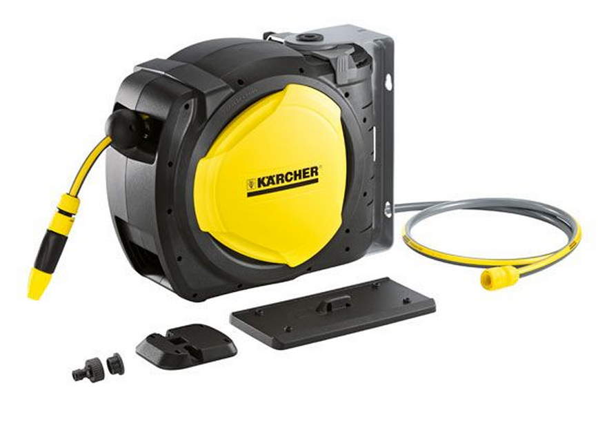 Автоматическая катушка для шланга. Плоский кронштейн для крепления катушки на стене. Автоматическое сматывание и распределение шланга. В комплекте шланг 1/2" 20 метров.+ рапылитель с коннекторами и штуцером для крана 3/4 на 1/2.