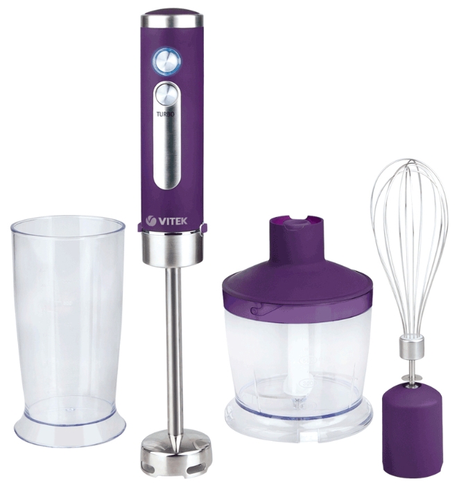 Блендер VITEK VT-3408 Тип: погружной Мощность 800 Вт. Управление механическое, число скоростей: 7, плавная регулировка скорости Дополнительные режимы турборежим Измельчитель есть, объем 0.5 л Мерный стакан есть, объем 0.6 л Суповарка нет Венчик для взбивания есть Материал корпуса пластик Материал погружной части металл