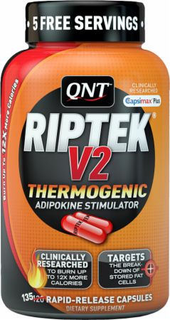 QNT1166 Riptek 120 caps. Riptek ( Риптек ) - Сильнейший жиросжигатель-термодженик для ускорения метаболизма и защитой от образования нового жира от QNT ( КУНТ ). Продукт построен на комплексе Capsimax - это вытяжки из красного перца обладающие шикарными жиросжигающими свойствами. Например обмен веществ ускоряется в 12 раз! Исследования показали, что Capsimax не только сжигает лишние калории для энергии, но и повышает вентиляцию легких, увеличивает поглощение кислорода, и активно снабжает им ткани. По этой причине даже при высоких нагрузках и активном сжигании калорий, Riptek заметно улучшает самочувствие! Riptek также подавляет способность тела синтезировать жир и тормозит рост новых жировых клеток. Этот эффект достигается за счет экстрактов фиолетовой кукурузы (maiz morado) и ягод асаи, а также ресвератола (мощного антиоксиданта, действующего на жировые клетки). Эта смесь позволила не набрать вес опытной группе, в исследовании с использованием диеты с высоким содержанием жира без ограничения количества приемов пищи! Кроме того, Riptek помогает подавить аппетит благодаря берберину (стабилизирует сахар в крови), и глюкоманан (дает ощущение сытости). Наконец, Riptek дает Вам увеличенную энергию для тренировок за счет кофеина и пикамилона, который также улучшает память и мозговое кровообращение. Для усиления действия в Riptek содержится пиперин – алколоид, который повышает биодоступность всех компонентов и препятствует их скорому выводу из организма. Таким образом Riptek является неимоверно сильной формулой для сжигания жира! Способ применения: Принимайте 3 капсулы два раза в день с водой. Используйте одну порцию утром и одну вечером. Для получения оптимальных результатов в дни тренировок принимайте Riptek за 30 минут до тренировки. ВАЖНО. Внимание! Не более 2 порций в день. Не используйте в течение 3 часов до сна.