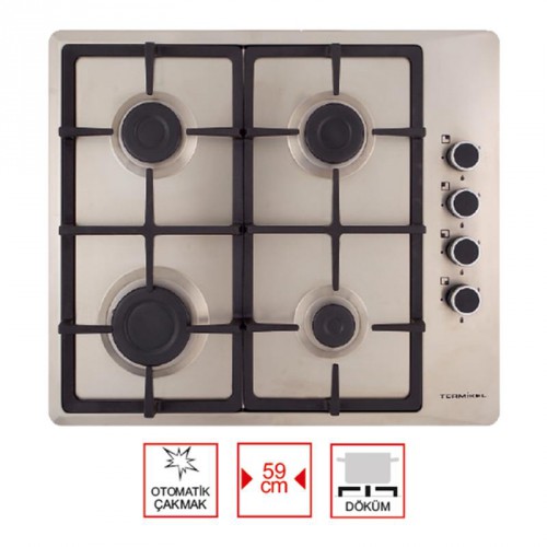 Варочная панель TERMIKEL 17136 - X 604D Характеристики Тип поверхности: варочная Материал поверхности: нержавеющая сталь Способ подключения: газовая Габаритные размеры (ШxГ): 590x510 мм Установочные размеры (ШxГ): 560x490 мм Конфорки Всего конфорок: 4 Газовых конфорок: 4 Особенности: автоподжиг, газ-контроль Панель управления Расположение панели: сбоку Переключатели: поворотные