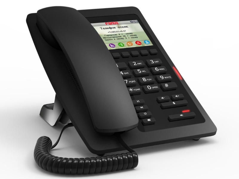 Fanvil H5, VoIP phone with SIP support IP-телефон Fanvil H5 создан специально для отелей, предъявляющих высокие требования к телефонной инфраструктуре и качеству сервиса. Поддерживает до 2-х SIP-аккаунтов, питание PoE, аудио HD-качества. На телефоне цветной дисплей и 10 программных клавиш, операционная система на базе Vxworks, поддержка защищённых протоколов: SIP over TLS и SRTP, совместимость с большинством платформ для IP-телефонии: 3CX, Asterisk, Broadsoft, Elastix, Zycoo, и др. Соответствует международным стандартам CE/FCC. IP- телефон Fanvil H5 может быть установлен на стол или смонтирован на стену. Особенности IP-телефона Fanvil H5 Цветной экран 3.5 дюймов, показывающий информацию об отеле; 6 редактируемых клавиш быстрого доступа; USB-порт для зарядки мобильного телефона; Индикатор вызова / наличие сообщения, индикатор гарнитуры; Удержание вызова; Голосовое сообщение; Перевод вызова; Совместимость с основными платформами: Broadsoft, 3CX, Asterisk, Elastix и т.д. 2 линии SIP Поддержка аудио HD качества; Поддержка PoE; Настольный вариант и вариант настенного монтажа. Функции обработки вызовов: Удержание вызова Отключение микрофона Ожидание вызова Перевод вызова (с уведомлением и без) Поддержка Caller ID Перевод вызова (Безусловная/По занятости/При отсутствии ответа) Повтор вызова Поддержка режима «Не беспокоить!» (DND) Авто ответ Голосовая почта (зависит от сервера) 3-х сторонняя конференция Горячая линия CLIR – запрет анонимных вызовов CLIP – разрешить анонимные вызовы Поддержка Multicast Автоповтор последнего набранного номера Быстрый набор Автоответ Горячая линия Функция экстренных вызовов Гибкий план набора Обратный вызов (Call Back) Защита вызова паролем, возможность скрывать набранные символы Acion URL/Active URI Чёрный список Список разрешённых вызовов Блокировка клавиатуры Функция оповещения (Intercom) Встроенная телефонная книга на 500 записей Поддержка удалённой телефонной книги по XML или LDAP Журнал пропущенных, исходящих и входящих вызовов (каждый на 300 записей) Индикация голосовой почты Поддержка протокола синхронизации времени NTP. Аудио: Микрофон и спикерфон HD качества ( 0 ~ 7кГц) Поддержка узкополосных кодеков: G.711a/u, G.723.1,G.726-32K, G.729AB Широкополосный кодек: G.722 Эхоподавление с длительностью 96мс Обнаружение речевой активности (VAD) / Генерация комфортного шума(CNG) Компенсация потерянных пакетов (PLC) Динамический джитер буфера до 300мс Передача DTMF: In-band, RFC2833, SIP INFO. Сетевые функции: 2 порта Ethernet 10/100 Мбит/с (модель X4) или 10/100/1000 (модель X4G) в режиме работы Bridge Режим получения IP – Статический, DHCP, PPPoE Поддержка 802.1x Поддержка VPN: L2TP (базовый, нешифрованный) / OpenVPN Поддержка VLAN Поддержка QoS Поддержка STUN SNTP клиент Поддерживаемые протоколы: SIP2.0 over UDP/TCP/TLS RTP/RTCP/SRTP STUN DHCP PPPoE 802.1x L2TP (Basic Unencrypted) OpenVPN SNTP FTP/TFTP HTTP/HTTPS TR069 Список поддерживаемых RFC: 354/1321/1350/1769/1889/1890/2131/2132/2616/2617/2661/2833/2976/3261/3262/3263/3264/3265/3268/3311/3489/3711/4346/4566/5630/5865 Управление: Автонастройка через FTP/TFTP/HTTP/HTTPS/DHCP OPT66/SIP PNP/TR069 Управление через WEB Сохранение/загрузка конфигурационного файла Автоматическая или ручная загрузка нового программного обеспечения Поддержка TR-069 и Syslog Физические характеристики: Диапазон частот громкоговорителя, микрофона, телефонной трубки (0 – 7кГц) Производитель процессора: Broadcom Электропитание: DC 5V/1A WAN Port - 10/100 BASE-T RJ-45 для LAN LAN Port - 10/100 BASE-T RJ-45 для ПК Электропотребление: в режиме ожидания – ~ 2.5Вт, при пиковой нагрузке – ~ 2.8Вт