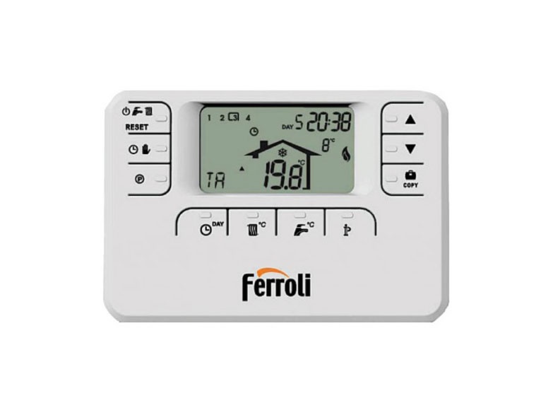 Дистанционное управление ROMEO беспроводное Ferroli 013101XA ФУНКЦИИ — многофункциональный дисплей (отображение времени и даты, режима работы, уровня мощности, неисправностей, температуру помещении и уличную); — установка недельной программы; — функция предварительного нагрева; — защита от блокировки насоса; — защита от замерзания; — регулировка температуры гвс и отопления; — погодозависимое регулирование температуры (при подключенном наружнего датчика); — режимы работы зима/лето; — функция «каникулы»; — проводная версия не требует элементов питания; — доступна беспроводная версия — Romeo W RF.