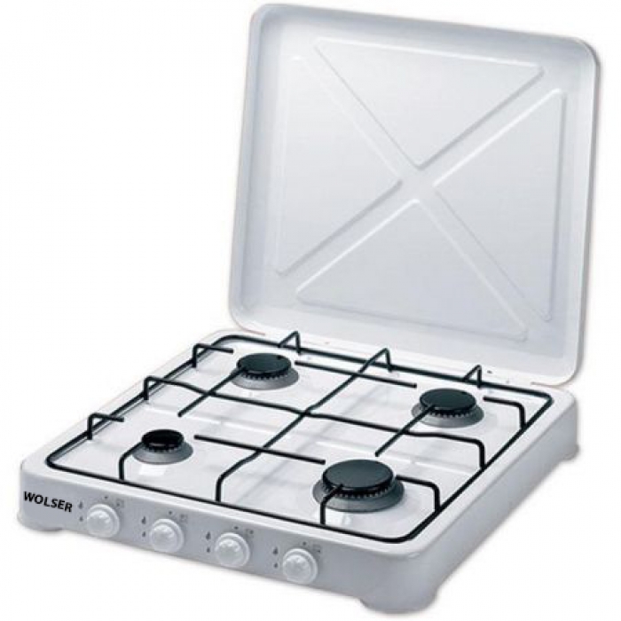 Настольная газовая плита Wolser WL-F 04 WE Исполнение: белая эмаль Кол-во конфорок: 4 Решетка: эмалерованная Тип: газ пропан бутан (балон) Пьезорозжиг конфорок