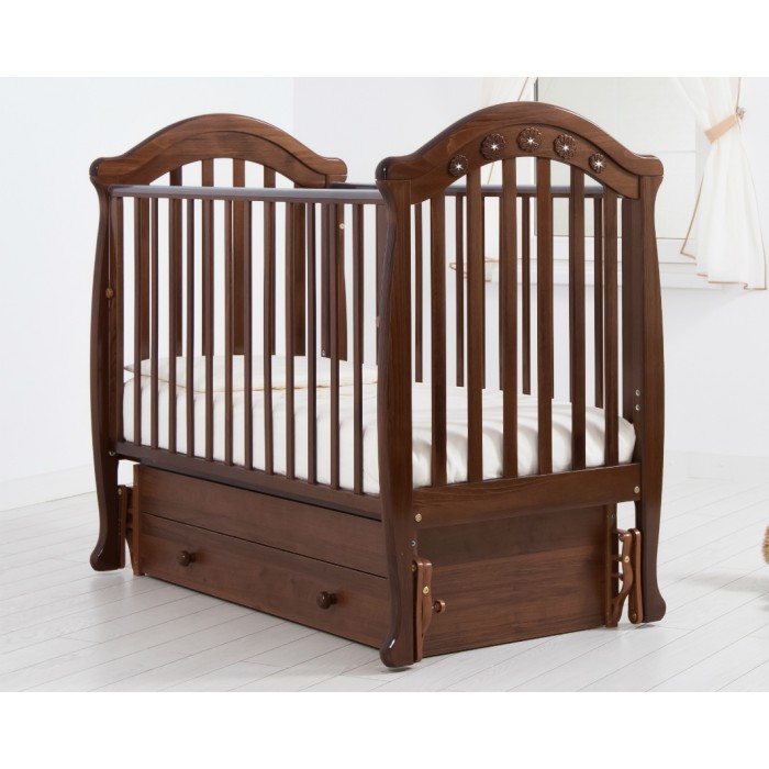 GANDYLYAN Кроватка с универсальным механизмом маятникового качания «Джозеппе» К. СВ. Материал: ДСП, Массив бука. Размер матраса в кроватку: 120х60 см. Съемная боковина: да. Количество уровней ложа: 2. Опускаемая боковина: да. Силиконовые накладки: да. Ящик для белья: да. Тип качания кроватки: маятник универсальный. Конструктивная особенность детской кроватки «Джозеппе» Гандылян — в оснащении ее универсальным маятниковым механизмом, позволяющим раскачивать ложе новорожденного в двух направлениях: продольном и поперечном. Направление выбирается при сборке кроватки. Дизайн этого изумительного детского ложа пропитан венецианской атмосферой, вызывающей в памяти образы скользящих по волнам итальянских каналов изящных гондол. Это ощущение можно усилить, оформив интерьер детской комнаты в теплых солнечных тонах. Уникальное свойство маятникового механизма в том, что он приводит кроватку в движение даже от самого незначительного толчка. Поэтому Вам не обязательно тратить массу времени на укачивание ребенка, ведь малыш, двигаясь в кроватке, способен сделать это сам. Амплитуда движений маятника ограничена. Если же качание кроватки нежелательно, специальный фиксатор сделает ее неподвижной (не забывайте пользоваться им во время бодрствования ребенка!). Корпус кроватки изготовлен из массива натурального кавказского бука, что гарантирует долговечность изделия. Конструкция не имеет острых углов, а поверхности всех деталей отшлифованы до зеркального блеска. Лак, покрывающий кроватку, безопасен для здоровья малыша, а благодаря своей прозрачности, он подчеркивает красивую фактуру буковой древесины. Передняя стенка кроватки имеет способность опускаться, облегчая родителям контакт с младенцем. Дно кроватки может быть установлено в двух положениях по высоте, что обеспечивает безопасность подросшему малышу. Вместительный ящик для белья в основании выполнен из ламинированного ДСП и снабжен шариковыми направляющими. Самыми важными свойствами АБС-пластика, из которого изготовлены накладки на верхние перекладины кроваток, являются его нетоксичность, эластичность и стойкость к каким-либо видам воздействия. Поэтому, эти накладки выполняют назначение защиты поверхности кроватки и десен малыша.