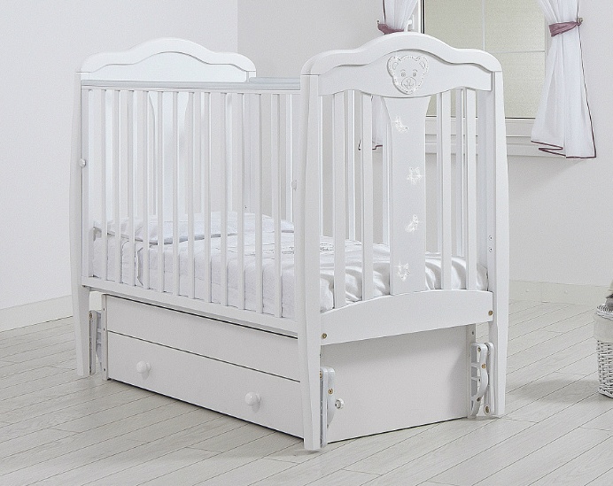 GANDYLYAN Кроватка с универсальным механизмом маятникового качания «Мишель» К. СВ. Кроватка GANDYLYAN «Мишель» оснащена универсальным маятниковым механизмом, который плавно раскачивает кроватку, не требуя усилий с вашей стороны. С помощью встроенного фиксатора вы можете остановить качание, как только ваш малыш заснет. Таким же образом кроватка фиксируется и на время бодрствования. Передняя стенка опускается, что облегчает контакт с ребенком. При необходимости ее можно снять. Спальное ложе регулируется по высоте в 2х положениях. Выдвижной ящик из ламинированного ДСП можно использовать для хранения постельного белья, одежды или игрушек. Шариковые направляющие обеспечивают плавное и практически бесшумное движение ящика. Кровать изготовлена из экологически чистого массива бука. Для покраски использованы безопасные нетоксичные материалы. Мебель сертифицирована и соответствует Государственному Стандарту. Особенности кроватки «Мишель»: Размер матраса в кроватку: 120*60 см Регулировка ложа по высоте: 2 уровня Съемная боковина Ящик для белья Основной материал: массив бука Материал ящика: ДСП