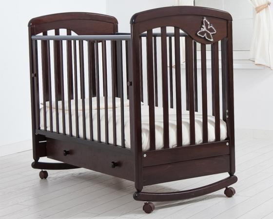 GANDYLYAN Кроватка на колесах с планкой для качания и ящиком «Джулия» К. СВ. Модная асимметрия в конструктивном дизайне кроватки-качалки со съемными колесами «Джулия» Гандылян украшена изящной бабочкой, выполненной кристаллами Swarovski. Кроватка имеет дуги-полозья для раскачивания и две пары колес на ножках, что облегчает ее перемещение по комнате. Центр тяжести кроватки сбалансирован таким образом, что максимальная амплитуда раскачивания безопасна для ребенка. Высокоглянцевое покрытие поверхностей кроватки защищает кожу малыша от травмирования. Используемый для покрытия лак имеет водорастворимую основу и безопасен для детей. Прозрачность лака подчеркивает уникальную фактуру буковой древесины. Опускающаяся передняя стенка облегчает контакт матери с ребенком и имеет надежный механизм фиксации. Дно кроватки может быть установлено в двух положениях по высоте. Вместительный ящик для белья в основании выполнен из ламинированного ДСП и снабжен шариковыми направляющими. Верхние перекладины покрыты нетоксичными силиконовыми накладками, играющими роль детских «грызунков». Тип кроватка классическая Модель Гандылян «Джулия» К-2002-24 Материал ДСП, массив бука Размер матраса в кроватку (ДхШ) 120х60 см Опускающаяся стенка есть Механизм качания продольные полозья