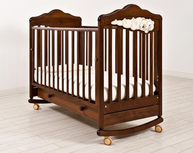 GANDYLYAN Кроватка на колесах с планкой для качания и ящиком «Изабель» материалы: массив бука, ДСП колеса со стопорами 2 уровня ложа, реечное дно размер ложа 120*60 см съемная опускаемая боковина силиконовые накладки фиксаторы боковины ящик для белья на бесшумных металлических направляющих