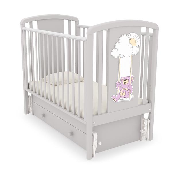 GANDYLYAN Кроватка с универсальным механизмом маятникового качания «Жаклин» Детская кроватка с универсальным маятниковым механизмом Angela Bella Жаклин Мишка на качелях для детей в возрасте от 0 до 3-х лет Характеристики: материалы: массив бука, ДСП 2 положения ложа по высоте размер ложа 120*60 см силиконовые накладки опускаемая съемная боковина закрытый ящик для белья Производитель Angela Bella (Россия) Россия Материал дсп, массив бука, мдф Размер матраса в кроватку 120х60 см Съемная боковина да Защитные накладки на боковинах да Количество уровней ложа 2 Ящик для белья да Тип качания кроватки маятник универсальный Внешние габариты (ДхШхВ) 126x70x110 см