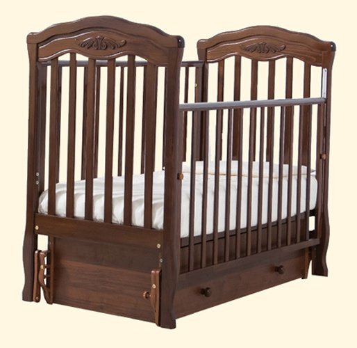GANDYLYAN Кроватка с универсальным механизмом маятникового качания «Шарлотта» Детская кроватка «Шарлотта» - очень красивая, удобная и функциональная кроватка с универсальным маятником и закрытым ящиком. Удобная и симпатичная кроватка «Шарлотта» станет украшением любого интерьера, подарит младенцу крепкий сон, а Вам время для отдыха. Особенности детской кроватки: -маятниковый механизм универсального качания - Вы сами решаете, будете использовать его как продольный,или как поперечный;-- -маятник можно зафиксировать, делая кроватку неподвижной; -уникальный (запатентованный) механизм опускаемой боковины в 2-х положениях с фиксатором; -два уровня ложе по высоте; -ортопедическое основание ложе кроватки; -удобный, вместительный выдвижной ящик для белья; -силиконовые накладки; -отсутствие острых углов и деталей. Детская кроватка «Шарлотта» изготовлена из натурального, высококачественного бука, (корпусные детали - ДСП) на современном оборудовании с применением экологически чистых и абсолютно безопасных лакокрасочных материалов, в соответствии с международными стандартами качества. Детская кроватка «Шарлотта» очень высокого качества, надежна и долговечна. Кроватка предназначена для малышей от самого рождения до 4-х лет. Дно детской кроватки можно регулировать по высоте в зависимости от возраста ребенка, то есть пока он не научился сидеть, дно кроватки устанавливается в верхнее положение, а затем - в нижнее положение. Выдвижной ящик детской кроватки очень функциональное и практичное дополнение к кроватке – он может использоваться для хранения постельного белья, памперсов, игрушек и всего, что должно быть «под рукой» у мамы. Ящик оснащен металлическими направляющими с лёгким скольжением. Размер спального места: 120х60 см. Производитель: Россия (г. Ставрополь, мебельная фабрика «Гандылян») ГОСТ 19917-93.