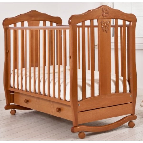 GANDYLYAN Кроватка на колесах с планкой для качания и ящиком «Доминик» Детская кроватка Гандылян Доминик Люкс – это качество в чистом виде! В производстве использована только натуральная древесина высокого качества. Все детали перед сборкой проходят тщательную шлифовку. Кроватка покрыта гипоаллергенными лаками на водной основе. Дизайн - лаконичный и в то же время очень милый, особый шик придает объемная мордочка мишки на торце. Реечные панели и ортопедическое дно на ламелях – это залог комфорта ребенка. Кроватка лишена неоправданно острых углов и мелких деталей слабой фиксации. Для подвижности конструкции она установлена на колесики с самоцентрирующимся механизмом и стопором. Ложе кроватки предусматривает 2 уровня регулировки по высоте. А еще есть вместительный ящик у основания, который экономит много места на хранение постельных принадлежностей. При необходимости кроватку можно установить на плавные полозья для качания. Производитель  Гандылян Страна производитель Россия Тип кроватки Классическая Тип механизма качания   колесо - качалка Колесики да