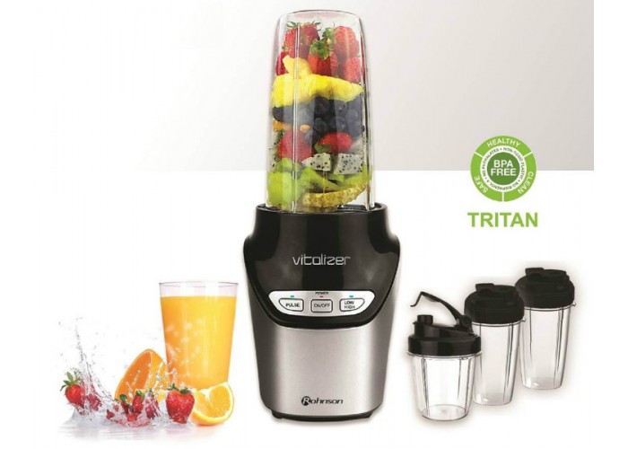 Блендер Rohnson R-534 Мощный 1000W 2 скорости + функция импульса Электронный контроль скорости Бисфенол-Тритан смесительный сосуд острые ножи режим ожидания автоматический отсекатель Мотор защита от перегрева 9 компонент входит: Базовая 1000W мощность 1 х 450 мл небольшое стекло 2 х 1000 мл высокий стакан 2 х покрывает To-Go 2 х охватывает сохранение свежих продуктов
