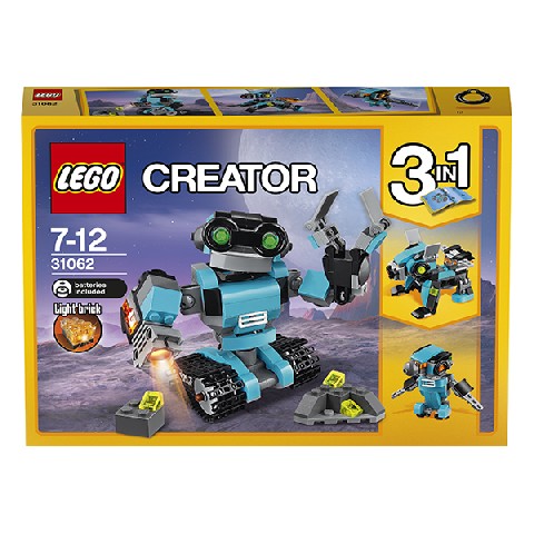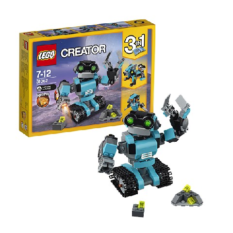Robo Explorer LEGO Creator Конструктор "Робот-исследователь" Знакомься с дружелюбным Роботом-исследователем. У него большая голова и большие зеленые глаза. Робот выполнен в красивой светло-голубой, черной и серой гамме. Ты можешь менять положение его рук, поворачивать голову и тело, и передвигать его при помощи колес. В его правой руке установлен специальный прожектор, а второй рукой он может хватать и переносить предметы! Модель трансформируется в Собаку-робота со светящимся реактивным ранцем или Птицу-робота со светящимися глазами! Количество деталей: 205 шт Pекомендуемый возраст: 7 - 12 лет