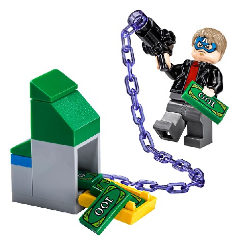 ATM Heist Battle LEGO Super Heroes "Ограбление банкомата" Собери из них здание банка с несколькими банкоматами. Преступники, скрывающие свои лица под масками Халка и Капитана Америка, решили ограбить его и для этого они используют пистолет, выстреливающий цепью. С помощью него, один из бандитов подцепил банкомат и пытается скрыться от погони на мотоцикле, в то время как другой преступник отстреливается из мощного гибридного шипомета! Помоги Человеку-Пауку остановить их с помощью его нового оружия - энергетических бластеров. Само здание банкомата не такое простое, как кажется на первый взгляд:оно раскрывается как книжка, а встроенные банкоматы выламываются из стены при помощи специального механизма. Конструктор состоит из 185 деталей и включает 3 минифигурки. Рекомендуемый возраст: 6 - 12 лет