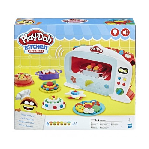 PD MAGICAL OVEN Hasbro Игровой набор Play-Doh "Чудо Печь" Приготовь свои любимые блюда с набором "Чудо Печь". Когда вы закроете дверь и поднимите рычаг, загорится подсветка в духовке и продукты будут выпекаться прямо как настоящие. Используя пластилин и различные аксессуары, ребёнок сможет создать восхитительные блюда: тортики, печенья и множество других вкусностей. Затем можно накрыть на стол, ведь в состав набора входят столовые приборы. Игровой набор "Чудо-печь" понравится всем юным кулинарам! Комплект поставки: Духовой шкаф, 5 насадок, аксессуары и 6 стандартных баночек пластилина. Рекомендуемый возраст: от 3 лет
