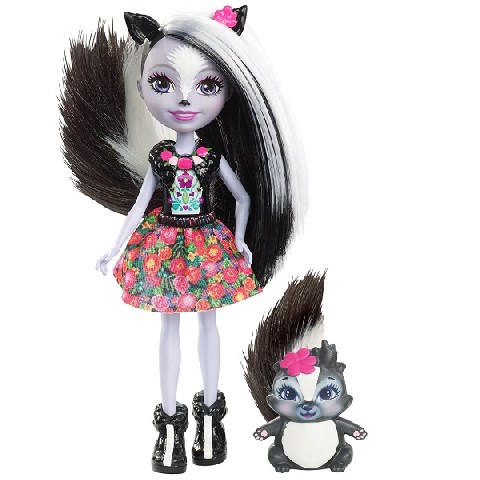 Papusa Enchantimals Sage Skunk Mattel Enchantimals Кукла "Седж Скунси" Перед вами Седж Скунси и ее милый пушистый скунс Кейпер. Они так похожи! У Седж есть ушки, хвостик и носик прямо как у ее зверька. А еще у нее светло-серая кожа, сиреневые глазки и длинные черно-белые волосы, которые можно расчёсывать. Наряд Седж просто роскошен: темный топ и пышная юбка разрисована цветами. А еще на ножках нашей героини красуются туфельки в виде скунсов, дополняющие образ. Высота куклы: 15 см Рекомендуемый возраст: от 4-х лет