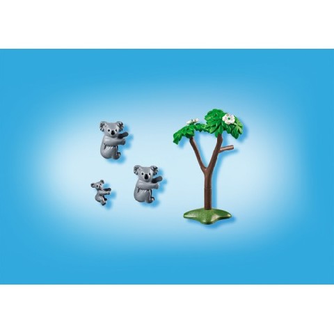 Playmobil Koala Family PLAYMOBIL "Семья коал с малышом" Семья очаровательных коал уютно расположилась на эвкалипте. Малыш коала может прикрепиться ко взрослому животному. Необычный конструктор "Семья Коал" от бренда Playmobil обязательно заинтересует деток от 4 лет. Он выполнен в виде двух взрослых коал и одного детеныша, сидящих на дереве с листиками и цветами. Животных можно крепить к веткам, а малыша к спинке мамы. Рекомендуемый возраст: от 4-х лет +