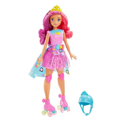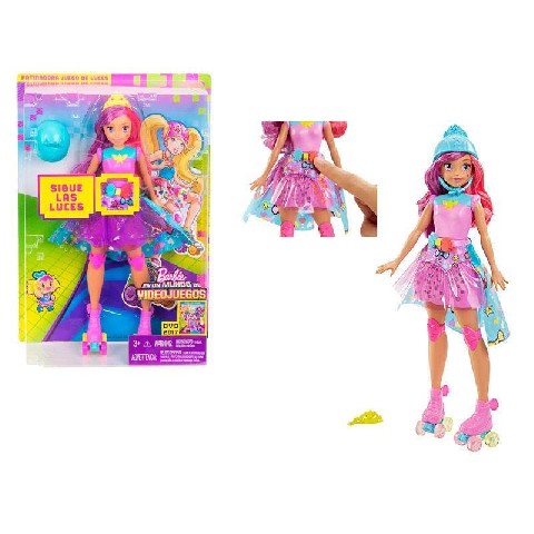 Papusa Barbie Pink seria "Video Gamer" Нажмите кнопку. Юбочка куклы по очереди засветится 3 цветами. Повторите последовательность с помощью кнопок на ремне куклы. Игра усложняется: всего имеется 5 уровней сложности. А еще ролики куклы светятся, и она готова мчать вперед! В комплект входят 3 батарейки типа AG13/LR44. Возраст:3+