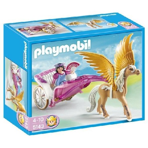 Princess with Pegasus Carriage Playmobil Игровой набор "Princess with Pegasus Carriage" Игровой набор Princess with Pegasus Carriage представлен в виде необычной кареты с лошадью и куклы. У лошади длинная светлая грива, седло, украшенное крыльями. Колеса золотого цвета отлично сочетаются с таким сказочным дизайном кареты. У куклы подвижные руки и ноги, что позволяет с легкостью посадить ее на сиденье кареты. Комплект: карета с лошадью, кукла. Рекомендуемый возраст: 4 - 10 лет