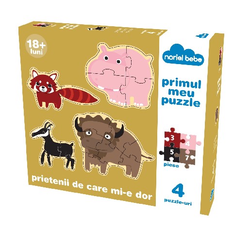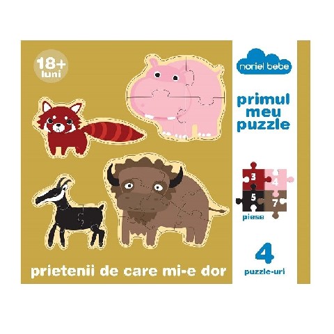 Prietenii de care mi-e dor Noriel-Bebe Пазл "Друзья, по которoм я скучаю" Животные которые в настоящее время находятся под угрозой исчезновения, с ними вы не имели возможности встречаться часто, это: красный енот, розовый бегемот, черная коза и бизон. Коллекция "Мой первый пазл" позволяет маленьким деткам открывать для себя красоту окружающего мира. С прекрасным качеством деталей и красочными иллюстрациями пазла в этой коллекции, которая обращена к любознательности ребенка, развитию его интеллекта, через незабываемый опыт, обеспечивая первые шаги в гармоничном развитии. Cодержит четыре пазла с 3, 4, 5 и 7 деталями. Pекомендуется для детей старше 18 месяцев.