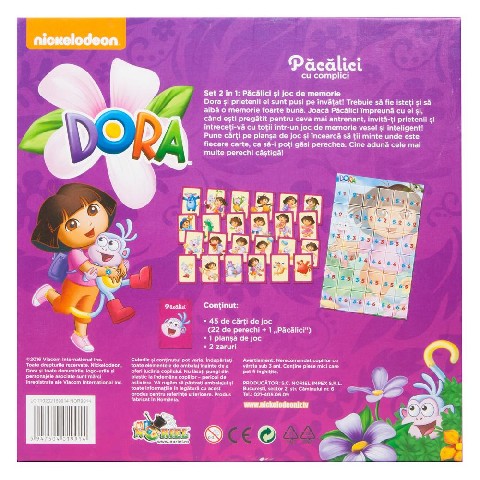 Pacalici cu complici - Dora the Explorer Noriel Настольная игра на память 2 в 1 "Исследователь Дора" (рум) Дора и ее друзья начинают учиться! Вы должны быть умными и иметь очень хорошую память. Сыграйте в Пэкэлич вместе с ними, и когда вы будете готовы к чему-то более интересному, пригласите своих друзей в веселую и умную игру на память! Положите карты на доску и попытайтесь вспомнить, где находится каждая карта, чтобы вы могли найти пару. Кто соберет больше пар, тот выигрывает! Cодержание: 45 игральных карт (22 пары + 1 Пэкэлич), 1 настольная игра, 2 кубика. Время воспроизведения: 1 час Рекомендуется для: 2-6 игроков Рекомендуемый возраст: 5 лет +