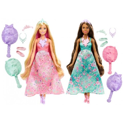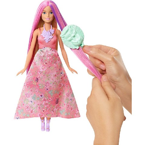 Papusa Barbie Princesa "Par Magic" ast Барби "Волшебные волосы" Принцессы Барби из Кучерявого Леса имеют волшебные волосы, которые меняет цвет. Во-первых поверни верхнюю часть головы куклы,чтобы переместить розовые пряди наперёд, намочив губку холодной водой,проведите по всей длине и они станут фиолетовыми, а затем теплой водой чтобы вернуть первоначальный цвет. С помощью тиары и ожерелья ваша кукла будет выглядеть еще более эффектно. Три различных образа для бесконечной игры! Возраст:3+
