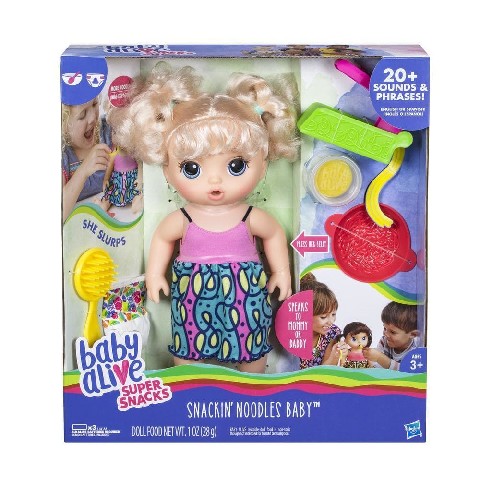 BA SNACKIN NOODLES BABY BLONDE Hasbro Говорящая детская "Kукла Baby Alive Blondy" Baby Alive любит лапшу, так что приготовьте свою домашнюю лапшу. В комплект входят макаронная машина и миска, чтобы сделать вкусную еду в течение нескольких минут. Положите специальную массу в сжимающее устройство и ... готово! Поместите макароны в миску и кормите ребенка. Не забывайте менять подгузник после еды! Вы также можете пощекотать ее животик и начать говорить. Маленькая кукла рассказывает детям, когда они голодны, просит лапшу, спасибо маме или папе и многое другое, говоря более 20 звуков и фраз. Решите и почистите ее волосы и приготовьте ей больше удовольствия с лапшой! Батареи: 2 x 1,5 В "AA" (включены) Рекомендуемый возраст: от 3 лет