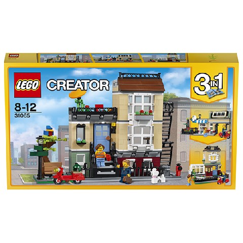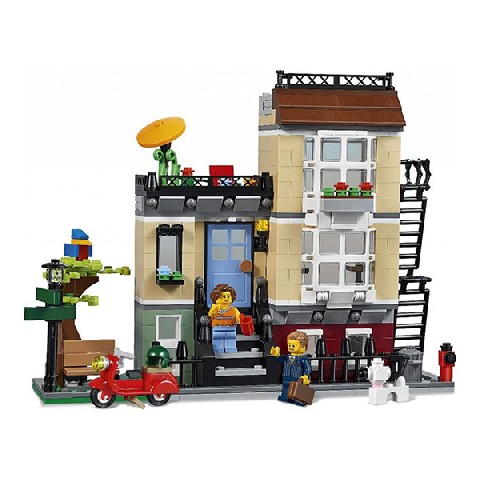 Park Street Townhouse LEGO Creator "Домик в пригороде" К синей входной двери этого очаровательного трехуровневого таунхауса ведёт небольшая лесенка. Внутри ты обнаружишь много интересного! Например, в уютной гостиной стоят телевизор с плоским экраном и диван, а ещё в доме есть комната с камином и кухня со всем необходимым. Если ты поднимешься по лестнице на второй этаж, там ты найдёшь удобную спальню, с балкона которой открывается вид на парк. Здесь ты можешь разводить цветы или наслаждаться коктейлями, укрывшись от солнца под зонтиком. А если тебе надоест сидеть дома, отправляйся на прогулку с милой собачкой или покатайся на крутом скутере! Этот удивительный набор трансформируется в Городское кафе или Пригородный дом с теплицей. Количество деталей: 566 Рекомендуемый возраст: 8 - 12 лет