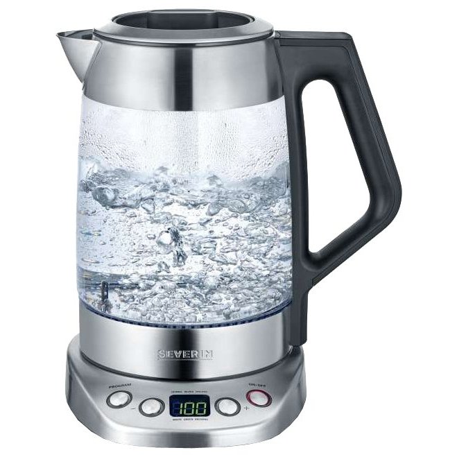 Электрочайник Severin WK 3479 чайник объем 1.7 л мощность 3000 Вт закрытая спираль установка на подставку в любом положении заварочный чайник в комплекте корпус из стали и стекла выбор температуры нагрева воды дисплей индикация включения
