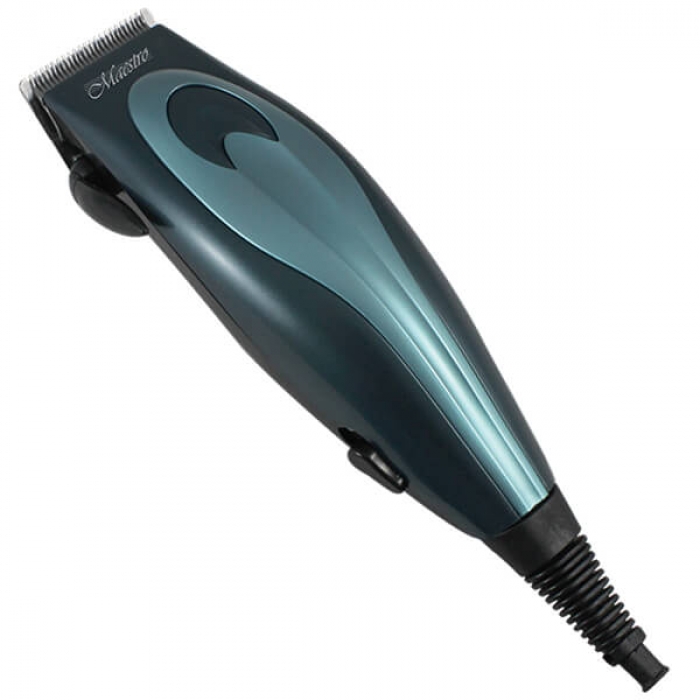 Машинка для стрижки Maestro MR -657 Мощность: 220-240В, ~50Гц, 15Вт Масло для смазки ножей в комплекте Щетка для чистки машинки Четыре сменных гребня (3,6,9,12) Ножницы Парикмахерская расческа Лезвия из нержавеющей стали Цвета: синий