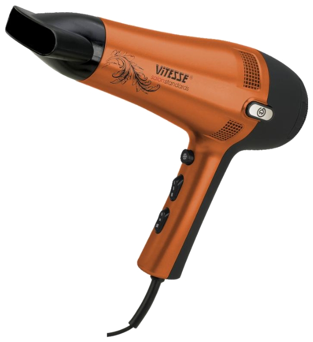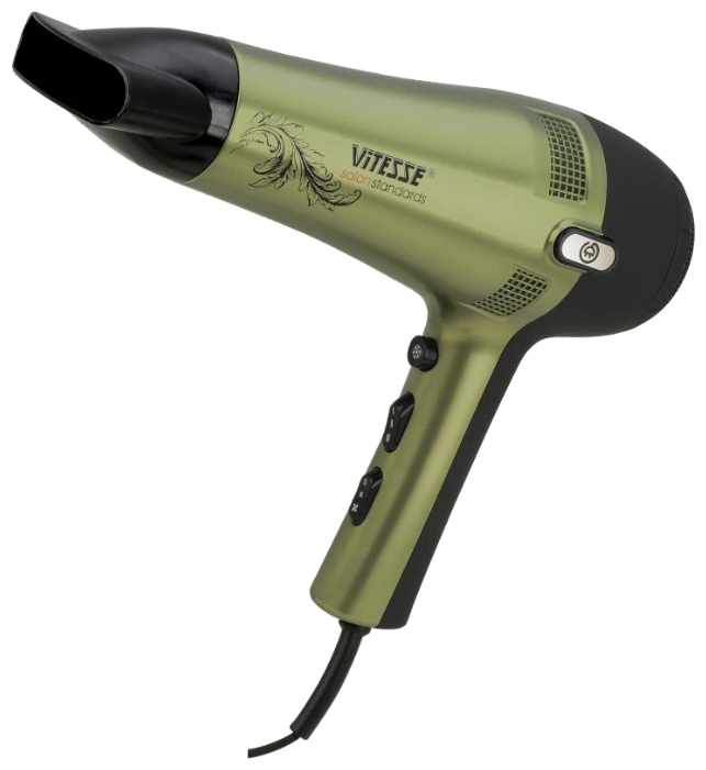 VITESSE фен VS-0942 (2100 Вт) Тип фен Мощность 2100 Вт Количество режимов 6 Независимая регулировка нагрева и воздушного потока есть, режимов нагрева: 3, режимов интенсивности воздушного потока: 2 Дополнительные режимы подача холодного воздуха, ионизация Конструкция автоматическое сматывание шнура В комплекте диффузор, концентратор