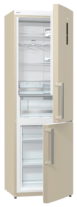 Холодильник GORENJE NRK 6192 MC Двухкамерный холодильник с системой NoFrost Plus, которая предотвращает образование инея на стенках, чем уменьшает энергопотребление, а также исключает необходимость размораживания. GORENJE NRK 6192 MC стильного шоколадного цвета станет дополнением к интерьеру любой кухни. Холодильник оснащен системой ионизации воздуха IonAir, которая создает здоровый и свежий микроклимат в камере для лучшего сохранения продуктов свежими. Этому способствует оптимальный уровень влажности, а также устранение частиц пыли, неприятных запахов и микробов. Благодаря многопоточной системе циркуляции воздуха MultiFlow 360° в камере устанавливается равномерная температура и распространяется ионизированный воздух. Интеллектуальная система AdapTech отслеживает периоды интенсивного открывания дверей и автоматически понижает температуру к этому времени, в следствии чего теплый воздух минимально влияет на продукты. Фрукты и овощи, положенные в контейнер CrispZone с контролем влажности HumidityControl, дольше сохранят свои полезные свойства и внешний вид. Контейнер FreshZone постоянно поддерживает температуру на уровне 3°C, что позволяет дольше сохранять свежесть продуктов в нем. При неплотно закрытой дверце и повышении температуры в камере холодильник оповестит об этом хозяина звуковым сигналом и световой индикацией. Холодильная камера имеет четыре стеклянные полки, две из которых имеют систему SimpleSlide, позволяющая переставлять и фиксировать их. Для удобного охлаждения бутылок имеется специальная металлическая полка. Сливочное масло, сыр и колбасу лучше всего хранить в контейнере MultiBox. Морозильная камера вмещает три больших ящика из прозрачного пластика, что облегчает поиск необходимых продуктов. Продукты больших габаритов можно разместить в ящике SpaceBox с увеличенным объемом. Тип холодильника двухкамерный Морозильная камера нижнее расположение Общий объем 329 л Общий полезный объем 307 л Полезный объем холодильной камеры 222 л Полезный объем морозильной камеры 85 л Класс энергопотребления A++ Потребление электроэнергии в сутки 0.64 кВт Потребление электроэнергии в год 235 кВт.ч/Год Количество компрессоров 1 Климатический класс N; SN; T; ST Производительность замораживания в сутки 5 кг Длительность хранения при отключении питания 18 ч Размораживание холодильной камеры No Frost Размораживание морозильной камеры No Frost Управление механическое Материал полок в холодильном отделении стеклянные Технические особенности зона свежести; многопоточная система охлаждения; быстрая заморозка; перенавешиваемые дверцы; оповещение о незакрытой дверце Функциональные особенности ионизатор Цвет бежевый Высота 185 см Ширина 60 см Глубина 64 см