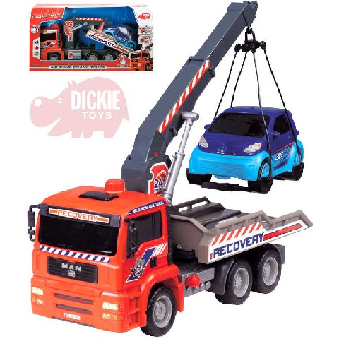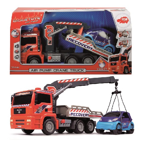 Dickie auto "Air Pump Crane Trac" 31 cm. SIMBA-DICKIE Dickie "Эвакуатор с механизмом подъема Air Pump" 55 см Удивите ребёнка таким функциональным и реалистичным эвакуатором. Ведь стоит только крохе нажать на рычаг, как закреплённая на тросах машинка начнет подниматься вверх, благодаря уникальному пневматическому насосу, предусмотренному в конструкции игрушки. Но самое главное, что ребёнку не придется подбирать автомобиль на роль груза, так как в комплекте уже есть яркая миниатюрная легковушка, с корой можно при желании играть и отдельно. Размер эвакуатора: 55 см Рекомендуемый возраст: от 3 лет