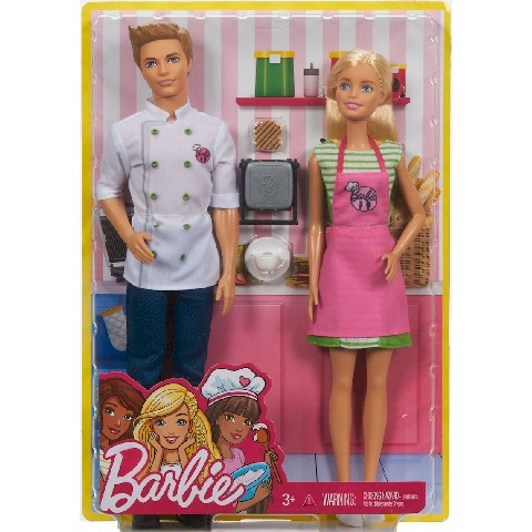 Barbie Set "Ken & Barbie" Mattel Mattel Набор из 2 кукол "Барби и Кен" Набор из 2 кукол Barbie & Ken из серии "Кем быть?" от бренда Mattel представляет собой игрушечную знаменитую пару, с которой можно разыграть интересный сюжет. Молодые люди очень дружны. Они вместе работают в уютном кафе, названном в честь Барби. Кен одет в двубортную одежду шеф-повара, стильные брюки и обут в классические черные туфли. На его белокурой красавице-подружке надето красивое полосатое платьице, а поверх него фартук. Не ее ногах - модные белые кеды. Девушка помогает своему другу, встречая и обслуживая гостей ресторанчика. Комплект игрушек дополняют тематические аксессуары - сырный тост на тарелке, прибор для выпечки вафель и чайная чашка. У кукол подвижны головы, руки и ноги. Bысота куклы: 30 см Комплект: 2 куклы, аксессуары. Рекомендуемый возраст: oт 3-x лет