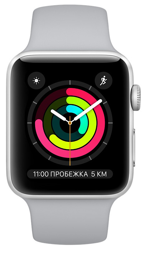 Смарт-часы Apple Watch Series 3, 38mm, Silver Aluminium Case, Sport Band, Fog На новой высоте Умные подсказки про физическую активность. Усовершенствованное приложение «Пульс». Любимые плейлисты прямо на запястье. Встроенный высотомер. И более мощный процессор, благодаря которому Siri на часах может говорить. Всё это — новые Apple Watch Series 3. У них как никогда много полезных функций, которые мотивируют на новые достижения, помогают быть активнее и позволяют оставаться на связи. Потрясающе спортивные часы Впервые Apple Watch оснащаются высотомером. Вместе со встроенным GPS-?модулем это позволяет Apple Watch Series 3 измерять показатели любых занятий спортом на улице. В обновлённом приложении «Тренировка» есть режим интервальных тренировок и возможность автоматически отмечать круги во время плавания. И музыки на вашем запястье теперь ещё больше — мотивация будет запредельной. Умный трекер активности Apple Watch Series 3 отслеживают ваши движения в течение дня, будь то прогулка с детьми, тренировка в спортзале или деловая встреча в другом конце города. Мощное устройство для здоровья Apple Watch Series 3 всегда у вас на запястье, поэтому с ними легче следить за здоровьем. Вы сможете контролировать свой сердечный ритм и справляться с повседневным стрессом. И даже устанавливать дополнительные приложения, которые помогут соблюдать диету или режим. Ежедневный помощник Ответьте на звонок со своих часов. Попросите Siri включить вашу любимую песню. Проложите маршрут к ресторану, где договорились встретиться. Если вы носите Apple Watch Series 3, то можете быстрее справляться с ежедневными задачами — прямо со своего запястья. Тип Умные часы Особенности Управление музыкальным плеером Управление камерой Шагомер Съемный ремешок Беспроводная зарядка Защита от воды, пыли GPS Есть Совместимая ОС iOS Wi-Fi Есть Тип матрицы OLED Время работы До 18 часов Разрешение дисплея 272х340 Операционная система Watch OS Процессор Двухъядерный процессор S3