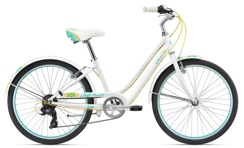Велосипед Giant Flourish 24 White 2018 Рама: ALUXX-Grade, алюминиевая Вилка: High Tensile steel, стальная, жесткая Руль: High Rise, 25.4, гнутый Вынос: Alloy Quill Подседельный штырь: Steel, 27.2 мм Седло: Giant Kids Педали: Nylon Platform Переключатели: Shimano RS45, 7 скоростей Передняя перекидка: Нет Задняя перекидка: Shimano Tourney, 7 скоростей Тормоза: Alloy, Linear Pull, алюминиевые, ободные Тормозные ручки: Alloy Jr. Adjustable Reach, регулируемые Кассета: Sunrun,7-ми скоростная, звезды 14x28Т Цепь: KMC HV500 Шатуны: Alloy 3-Piece, звезды 38 Каретка: Полу-картридж Обода: Giant Alloy, двойные Втулки: Alloy, 36h Спицы: Stainless Steel, 14g Покрышки: Kenda Street, 24x1.75" Дополнительно: Защита цепи, звонок, крылья, подножка