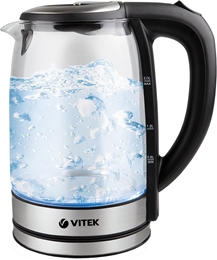 Электрочайник VITEK VT- 7013 Отключение при закипании да Защита от включения без воды да Поворот на 360 градусов да Отсек для шнура да Материал корпуса стекло Макс. потребляемая мощность, Вт 2200 Индикация включения да Индикатор уровня воды да Фильтр от накипи да Объем, л 2,0 Нагревательный элемент cкрытая спираль Цвет черный Доп. особенности световая индикация работы