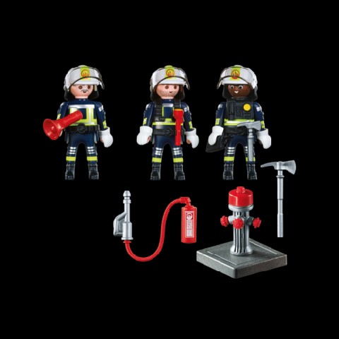 Fire rescue crew Playmobil Игровой набор "Команда пожарников" Игровой набор "Команда пожарников" из серии игрушек немецкого бреда Playmobil включает три фигурки в спецформе. Также в комплект входит оборудование для тушения пожара: шланг, который можно подсоединить к гидранту, фонарик, топор, громкоговоритель, рация. Пожарники будут всегда на связи и смогут вызволить из горящего здания жильцов, пробившись сквозь двери и окна. Фигурки имеют оригинальный внешний вид, у каждой из них подвижная голова и руки, в которых они могут удерживать разные предметы. Подойдет для большой сюжетной игры в "Город" вместе с другими наборами схожей тематики. Высота фигурки: 7.5 см Комплект: 3 фигурки пожарных в форме, топор, пожарный гидрант, шланг, оборудование (2 топора, фонарик, рация, громкоговоритель). Рекомендуемый возраст: oт 4-x лет