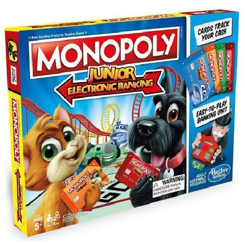 MONOPOLY JUNIOR ELECTRONIC BANKING Hasbro Настольная игра "Монополия с банковскими картами" Представляем вашему вниманию новую версию Монополии для детей от 5 лет! Такая игра будет особенно интересна младшим членам семьи, ведь она адаптирована для их возраста и сделана максимально веселой! Дети становятся владельцами музея, магазина игрушек, кондитерской и других мест, которые так привлекают детей, а также в процессе игры расплачиваются банковскими картами. Комплект: игровое поле, 4 банковские карточки, терминал, 4 фигурки персонажа, 20 карточек "Шанс", 48 значков "Продано", 4 карточки персонажа, кубик. Количество предполагаемых игроков: 2 - 4 Тип батареек: 2 х AAA / LR0.3 1.5V (не входят в комплект) Рекомендуемый возраст: 5 лет +
