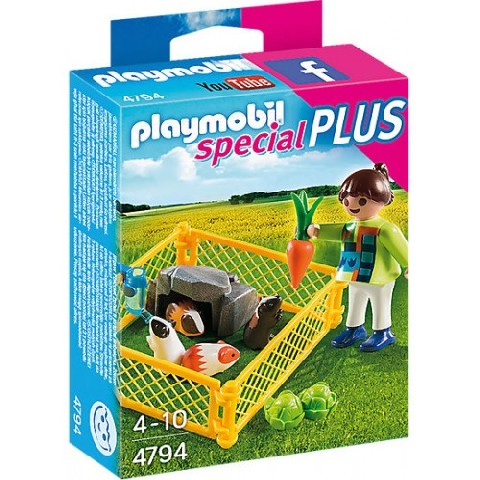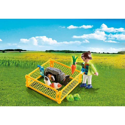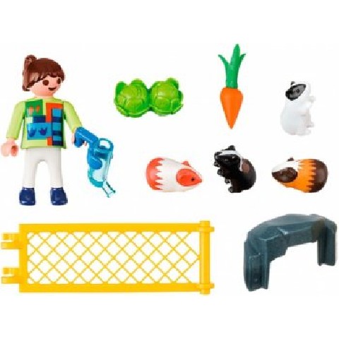 Girl with Guinea Pigs Playmobil Игровой набор "Девочка с морскими свинками" С набором от Playmobil ваш ребенок отправится на ферму и поможет девочке позаботиться о морских свинках. Его ждут новые эмоции и разнообразнейшие идеи для сюжетно-ролевых игр. В набор входит фигурка девочки с каштановыми волосами, в белых брючках, зеленой кофточке и синих ботиночках. У нее подвижные ручки, что позволяет создавать видимость движения. Комплектация: фигурка девочки, 4 морские свинки, 2 капусты, морковка, поильник, детали вольера. Рекомендуемый возраст: от 4 до 10 лет