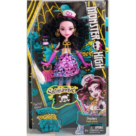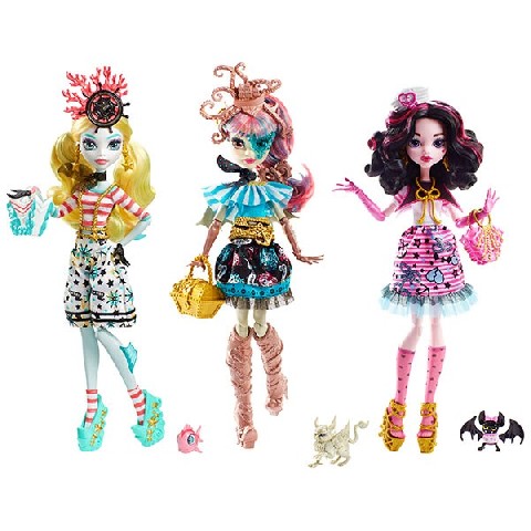 Papusa MH "Nautical Ghouls" ast Mattel Куклы MH "Пиратская авантюра" делюкс (в ассорт) Очаровательные куколки "Монстер Хай" потерпели кораблекрушение! Но это не помешает им оставаться модными и стильными, ведь они уже успели подружиться с пиратами и даже примерить их оригинальные наряды. Их пышные прически, как всегда, сияют, а одежда украшена неповторимыми аксессуарами, найденными на дне морей и океанов. Подругам уже не терпится отправиться на поиски приключений вместе со своими верными питомцами! Куклы имеют подвижные ручки и ножки, а шарнирный механизм позволяет сделать их позы еще более естественными. Комплектация: Kукла, питомец, аксессуары. Рекомендуемый возраст: 6 лет +