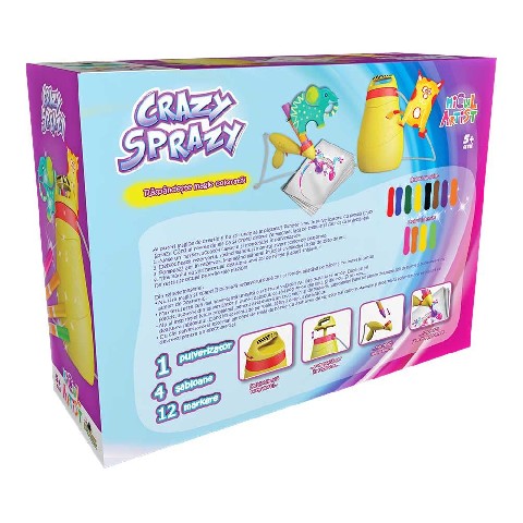 Crazy Sprazy - Party Color Spray Noriel Маленький артист "Party Color Spray" У вас есть магические творческие способности и не знаете, где их хранить? Когда вам нужно создавать очаровательные рисунки, вам просто нужно их распаковать, распыляя цвет! Остальное - это ваши магические способности! Содержание: 1 распылитель, 4 узора и 12 маркеров. Рекомендуемый возраст: 5 лет +
