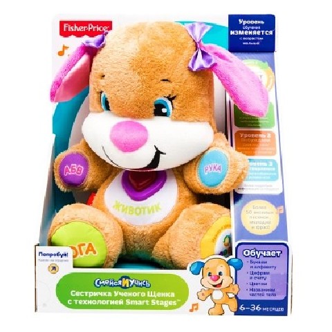 FP Surioara Inteligenta "Smart Stages" (rus) Fisher-Price Мягкая игрушка "Сестричка Ученого Щенка" (ру) Мягкая Сестричка Щенка готова учиться вместе с малышом! Она реагирует на прикосновение малыша, активируя увлекательные песенки и фразы, которые знакомят с более чем 100 словами, названиями частей тела, цветами, формами и не только! А поскольку каждый малыш развивается с собственной скоростью, Сестричка оснащена технологией Smart Stages, которая позволяет выбрать подходящий уровень. Игрушка предлагает разнообразные песенки, фразы и звуки на трех уровнях игры, соответствующих уровню развития малыша. Загорающееся огоньками разноцветное сердечко Сестренки мигает в такт музыке! Лапы, ухо и сердце Сестрички реагируют огоньками на прикосновение ребенка (5 точек активации в целом!) Обучает 100 базовым словам, знакомит с названиями частей тела, формами, счетом, алфавитом и многим другим! Питание: 3 батарейки типа АА 1,5V (включены) Размер щенка: 27 см Возраст: от 6 месяцев