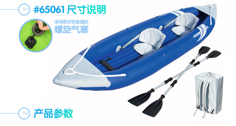 Bestway 65061 Лодка Каяк 3,85*93 см Производитель BESTWAY Лодка Каяк 3,85*93 см Длина - 3,85 м Ширина – 0,93 м Диаметр баллона – 0,285 м Количество гермоотсеков – 2 + 2 Грузоподъемность – 230 кг Пассажировместимость – 2 чел. Номинальное избыточное давление в баллоне – 0,2 бар Вес комплекта в упаковке – 14 кг Габариты в упаковке – 1 х 0,25 х 0,20 м