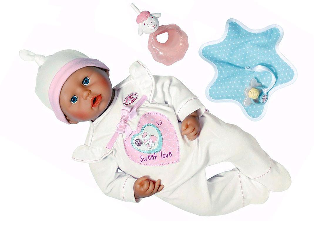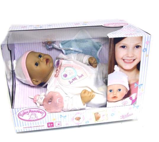 Кукла напоминает настоящего малыша не только на ощупь, но и ведет себя, как младенец, имея функции и издавая звуки, подобные малышам. Малышка лепечет, смеется,пьет воду из своей бутылочки, сосет пустышку с правдоподобной, соответствующей этому мимикой и плачет настоящими слезами. Baby Annabell реагирует на голос своей мамы. Чаще всего Baby Annabell радуется и лепечет на своем детском языке. После того как малышка попьет из своей бутылочки , то ей иногда нужно сделать отрыжку, а иногда она даже плачет, потому что у нее болит животик. В таком случае тебе нужно погладить ее по спинке, чтобы она смогла сделать отрыжку. Если положить малышку Baby Annabell и бережно провести по ее лобику рукой, то она станет сонной и начнет зевать. Тогда можно спеть ей песенку, чтобы помочь ей уснуть. Если она кричит, то можно бережно погладить ее лобик, чтобы помочь ей уснуть. В комплект входят: - кукла Baby Annabell - бутылочка - пустышка - одеялко Для работы необходимо 4 батарейки LR6(AA), в комплект не входят. Высота (см): 46 Возраст от: 3 лет