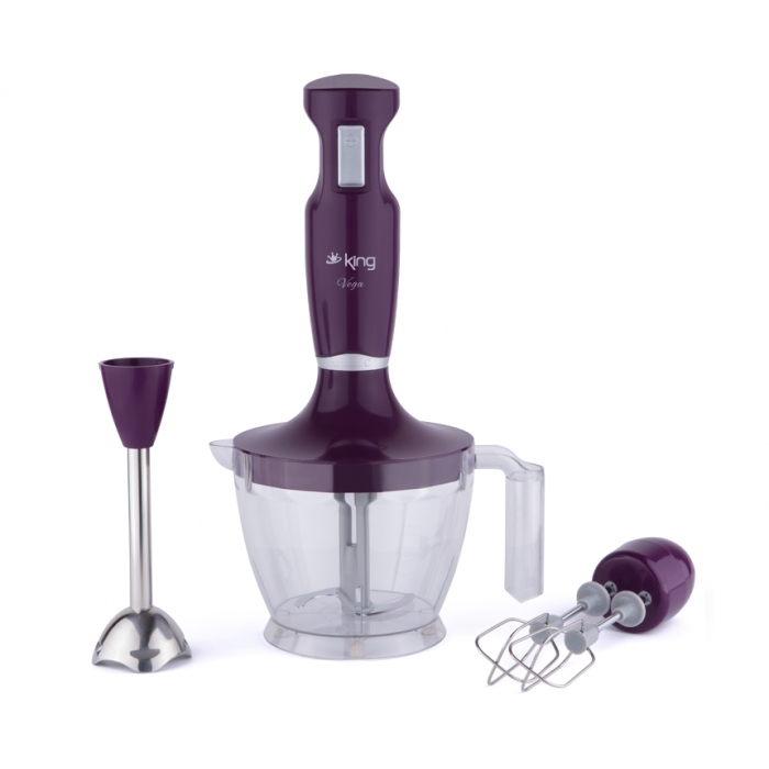 Блендер KING K 972 Производитель: KING Мощность (Вт): 700 Цвет: фиолетовый Тип: Погружной Материал корпуса: Пластик Материал ножки Нержавеющая сталь Количество скоростей: 2