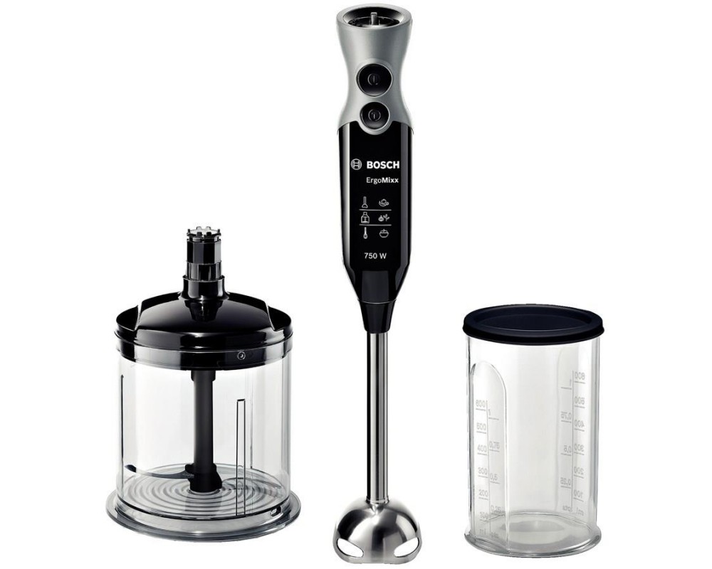 Блендер Bosch MSM67170 Мощный мотор 750 Вт для идеальных результатов 12 режимов скорости, подходящих для любой функции и дополнительная кнопка турбо-режима для максимальной мощности простым прикосновением Ножка блендера из нержавеющей стали с острым лезвием QuattroBlade с четырьмя лопастями облегчает процесс приготовления пюре, смешивания и измельчения Удлинительный спиралевидный шнур для максимальной гибекости при использовании прибора Эксклюзивные аксессуары: чоппер, напр. для измельчения трав и специй, орехов и сыра, с дополнительным ножом для измельчения льда в кубиках и венчик для взбивания белков и крема