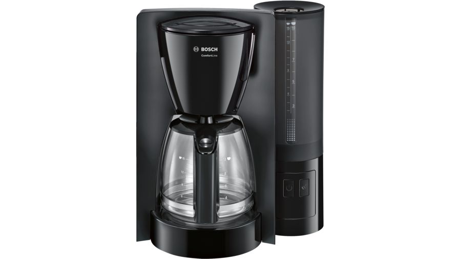 Электрокофеварка Bosch TKA6A043 капельная кофеварка для молотого кофе отключение при неиспользовании корпус из пластика ощность: 1000-1200 Вт Стеклянный кофейник на 10/15 чашек Функция "Капля-стоп" Съемный фильтр (1х4) Прозрачный, съемный резервуар для воды с встроенной ручкой и индикатором уровня воды