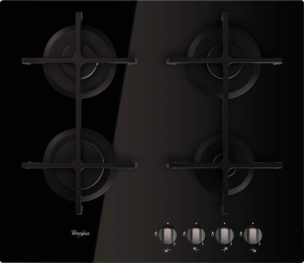 Варочная панель WHIRLPOOL GOS 6413/NB газовая варочная панель поверхность из закаленного стекла 4 газовые конфорки переключатели поворотные электроподжиг независимая установка габариты (ШхГ) 59x51 см