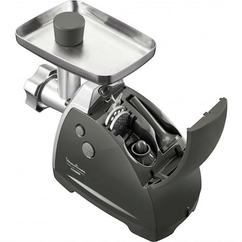 Мясорубка MOULINEX ME688832 мощность 800 Вт перерабатывает 4.5 кг/мин насадка-терка, насадка для шинковки, насадка для кеббе, диск для фарша сделана из пластика и металла отсек для хранения насадок